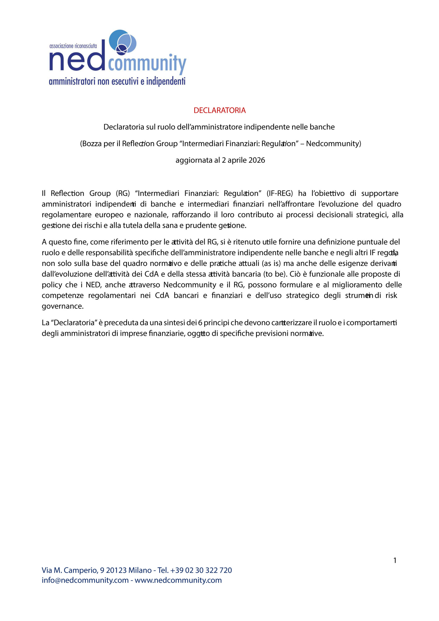 Declaratoria sul ruolo dell’amministratore indipendente nelle banche